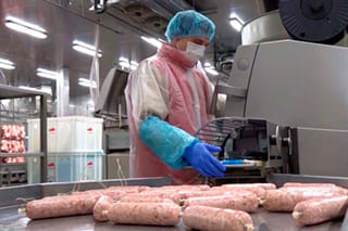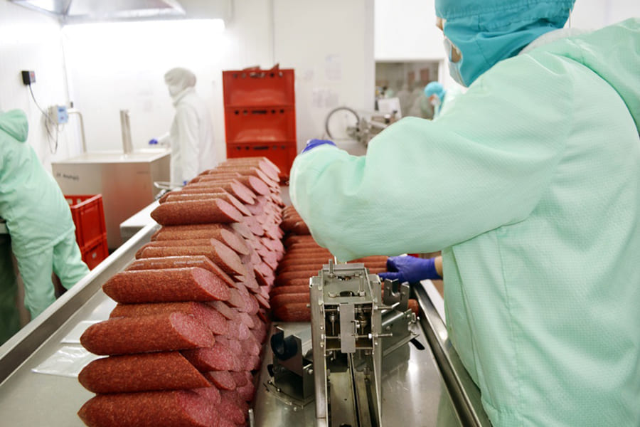 - Формовка батонов колбасы на линии производства полукопченой продукции.