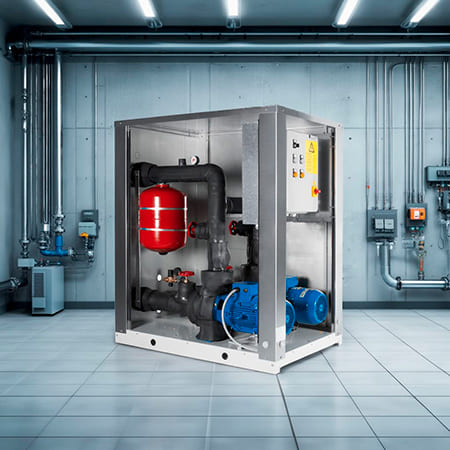 - Регулирующая функция: поддерживая оптимальный уровень, осуществляет плавный контроль давления в кПа, идет защита от перепадов, поэтому избыточного давления не возникает при работе с подобной насосной станцией чиллера.