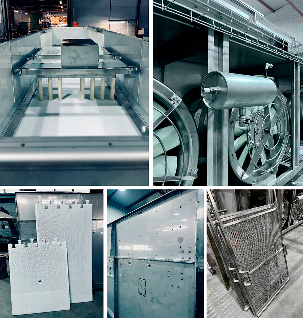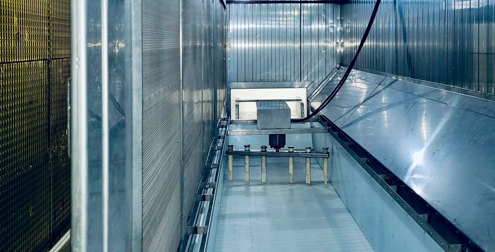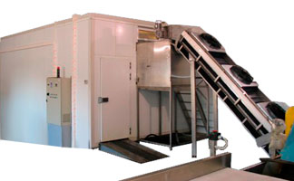 - Рамы-опоры двух транспортных лент. Устанавливаются на полу камеры на опорах с изменяемой высотой. Оснащаются 5 вентиляторами и 2 батареями испарителями с диффузорами. В верхней части над лентами расположены ограждения таким образом, чтобы создать канал для перемещения замораживаемого продукта и защиты от потери продукта в сторону от ленты. На завершающей части транспортера участка домораживания к раме крепится емкость для временного складирования прошедших обработку продуктов. На выходе с внешней части камеры установлен лоток с заслонкой.