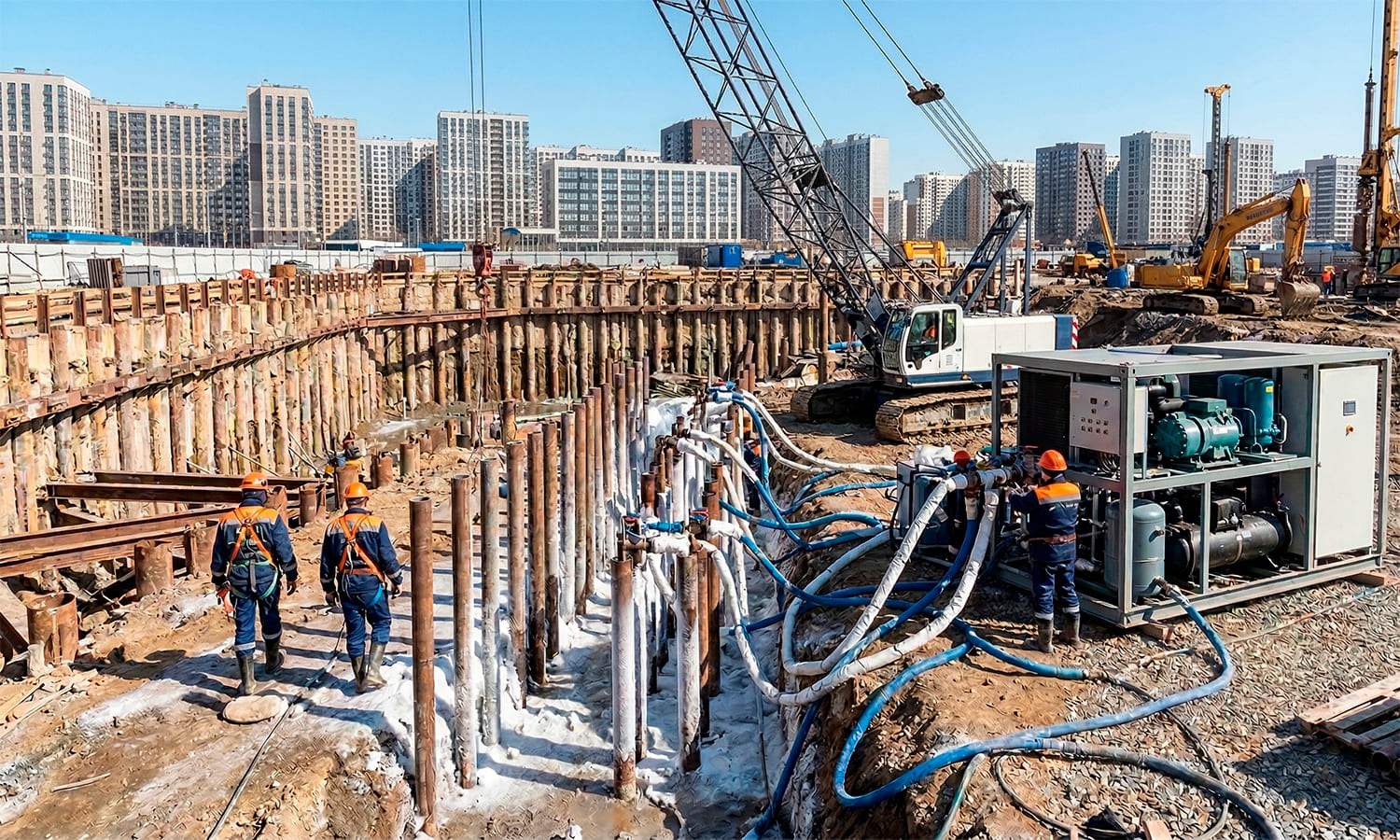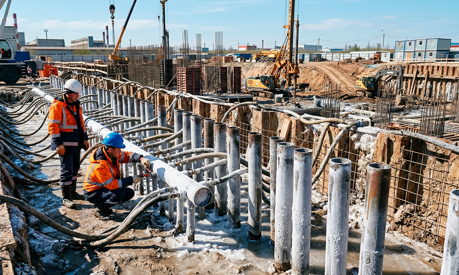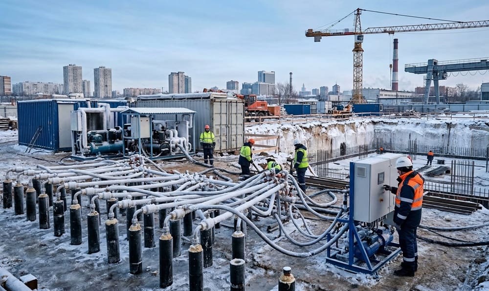 Что такое искусственное замораживание грунта? Это метод, при котором грунт замерзает для укрепления конструкции в сложных геологических условиях, создавая необходимый уровень безопасности при строительстве подземных сооружений и фундаментов зданий и сооружений. Метод помогает добиться высокой прочности и водонепроницаемости.