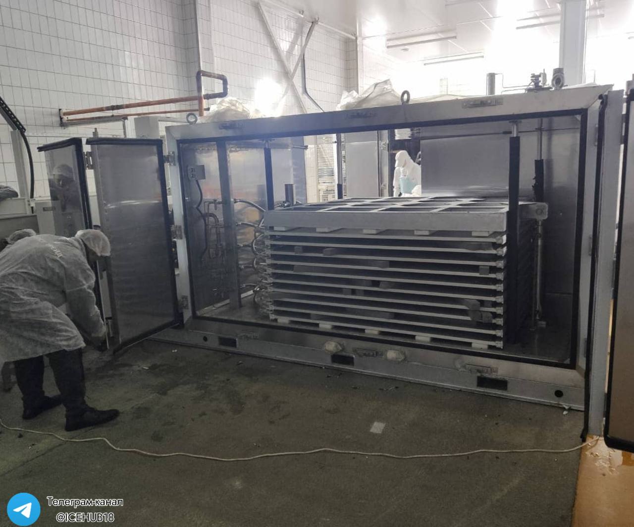 Произведена установка трех плиточных скороморозильных агрегатов (плиточников) производительностью по 10 тонн в сутки. Данные устройства предназначены для ускоренной заморозки и охлаждения различных продуктов (рыбы, мяса, овощей, фруктов). Холодильные установки собирались из комплектов оборудования, имеющегося в наличии на складе компании, в исполнении "моноблок с конденсатором". Для реконструкции была осуществлена их резка с выпиливанием конденсатора и выносом части рамы на улицу